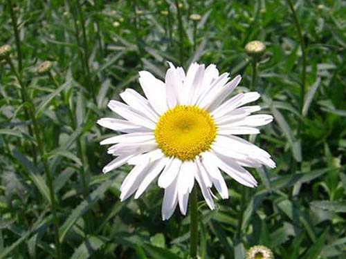 滨菊(Leucanthemum vulgate Lam.)菊科多年生草本,高15-80厘米。茎直立,通常不分枝,被绒毛或卷毛至无毛。基生叶花期生存,长椭圆形、倒披针形、倒卵形或卵形,基部楔形,渐狭成长柄,柄长于叶片自身,边缘圆或钝锯齿。全部叶两面无毛,腺点不明显。头状花序单生茎顶,有长花梗,或茎生2-5个头状花序,排成疏松伞房状。总苞径10-20毫米。全部苞片无毛,边缘白色或褐色膜质。瘦果长2-3毫米,无冠毛或舌状花瘦果有长达0.4毫米的侧缘冠齿。花果期5-10月。