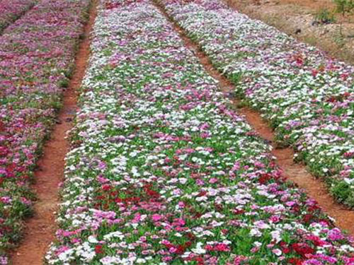 石竹株型低矮,茎秆似竹,叶丛青翠,自然花期5-9月,从暮春季节可开至仲秋,温室盆栽可以花开四季。花顶生枝端,单生或成对,也有呈圆锥状聚伞花序,花径不大,仅2至3厘米,但花朵繁茂,此起彼伏,观赏期较长。花色有白、粉、红、粉红、大红、紫、淡紫、黄、蓝等,五彩缤纷,变化万端。园林中可用于花坛、花境、花台或盆栽,也可用于岩石园和草坪边缘点缀。大面积成片栽植时可作景观地被材料,另外石竹有吸收二氧化硫和氯气的本领,凡有毒气的地方可以多种。切花观赏亦佳。